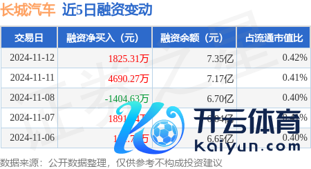 本站音问万博manbext体育官网app官网,11月12日,长城汽车(601633)融资买入1.53亿元,融资偿还1.34亿元,融资净买入1825.31万元,融资余额7.35亿元,近20个来回日中有16个来回日出现融资净买入。