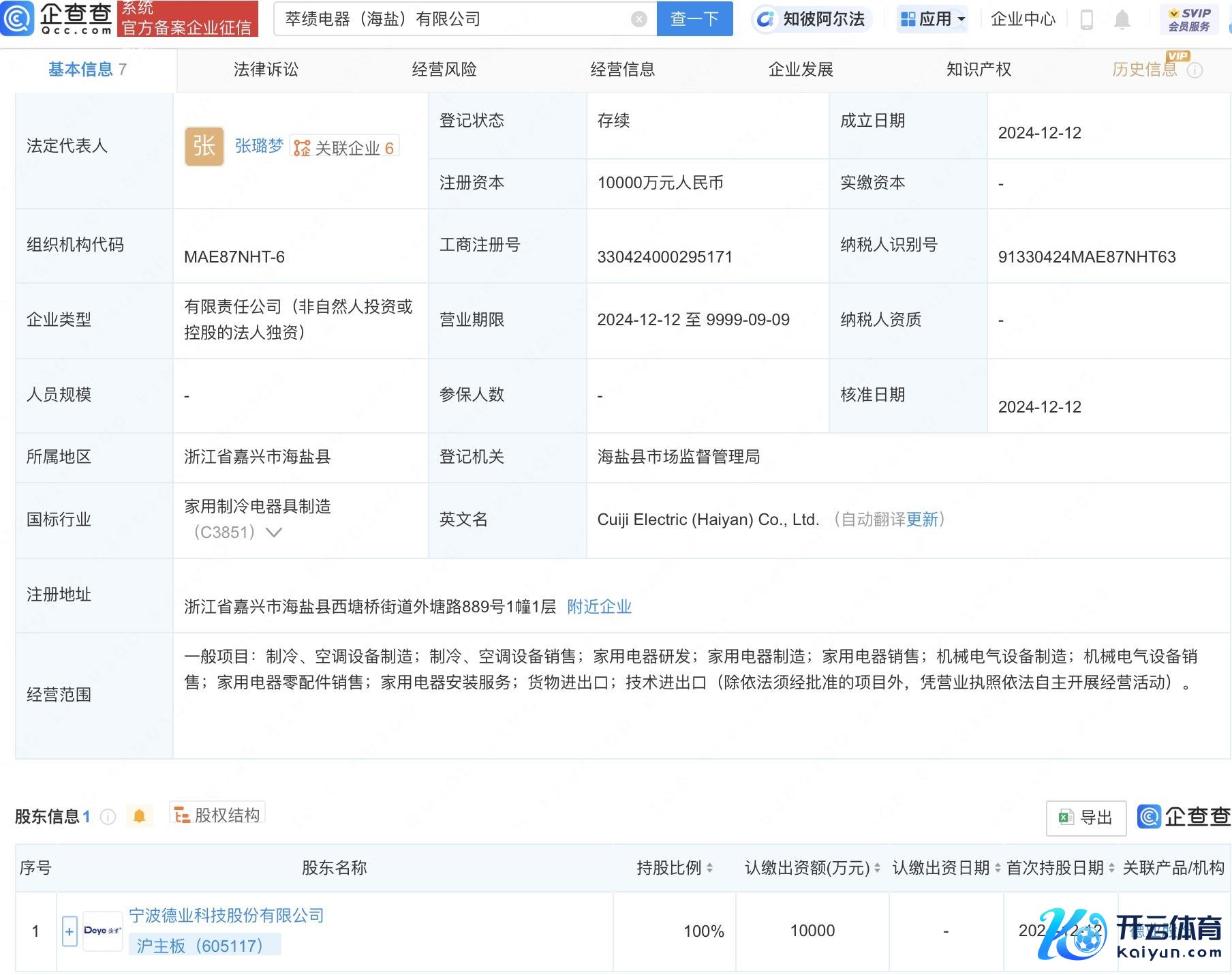 企查查APP裸露万博manbext体育官网app官网,近日,萃绩电器(海盐)有限公司建筑,法定代表东说念主为张璐梦,注册成本1亿元东说念主民币,估量畛域包含:制冷、空调开采制造;制冷、空调开采销售;家用电器研发等。企查查股权穿透裸露,该公司由德业股份(605117)全资握股。