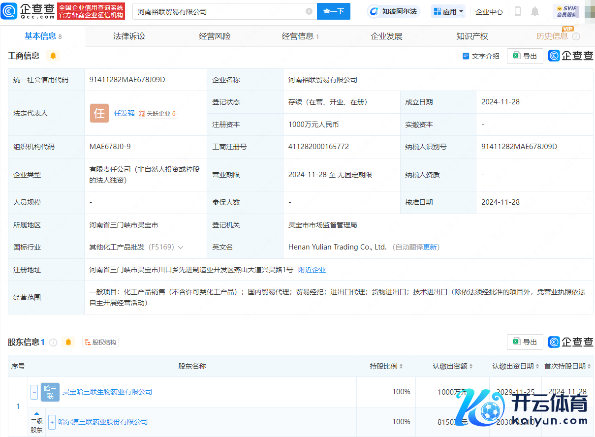 企查查APP涌现,近日现金万博manbext体育官网app平台,河南裕联买卖有限公司建造,法定代表东说念主为任发强,注册成本为1000万元东说念主民币,缠绵限制包含:化工居品销售;国内买卖代理;买卖经纪;出进口代理;货品出进口;本事出进口等。企查查股权穿透涌现,该公司由哈三联(002900)波折全资捏股。