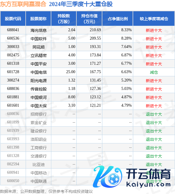 东方互联网嘉搀杂为搀杂型-纯真基金,证明最新一期基金季报涌现,该基金钞票树立:股票占净值比94.79%,债券占净值比5.19%,现款占净值比2.44%。基金十大重仓股如下: