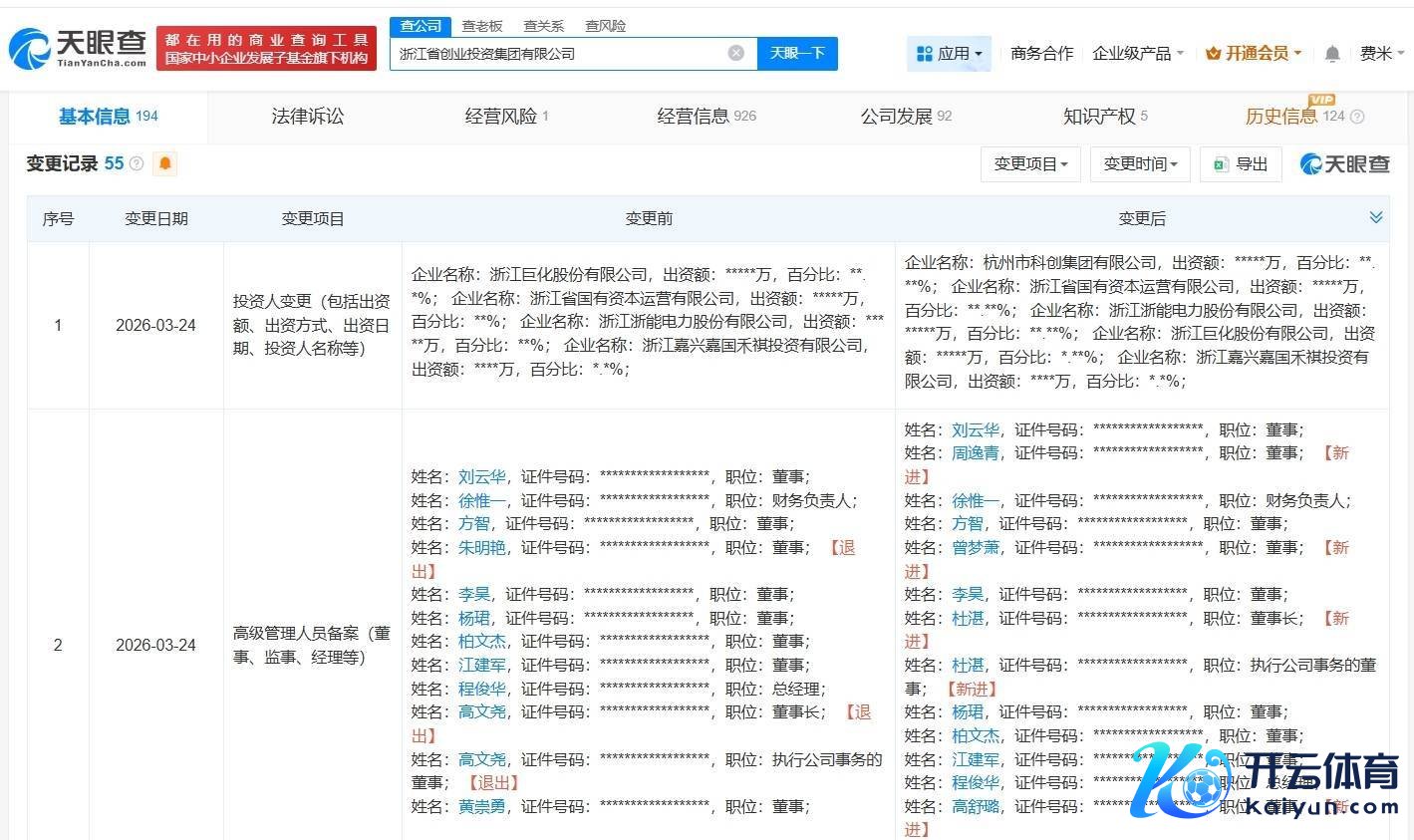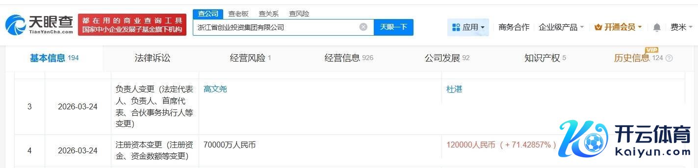 南边财经3月30日电,天眼查App显现,近日,浙江省创业投资集团有限公司发生工商变更万博manbext体育官网娱乐网,高文尧卸任法定代表东说念主、引申公司事务的董事,由杜湛接任,新增杭州市科创集团有限公司为鼓励,同期,注册本钱由7亿东说念主民币增至12亿东说念主民币,增幅约71%。该公司栽植于2000年9月,计较界限为私募股权投资、投资贬责、投资磋磨、企业贬责磋磨,现由浙江省国有本钱运营有限公司、浙能电力(600023)及上述新增鼓励等共同抓股。