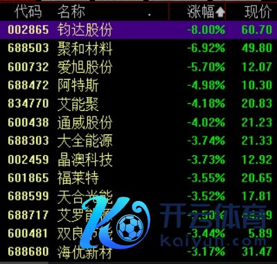 钧达股份跌8%,聚和材料跌近7%,爱旭股份跌近6%,艾能聚、晶澳科技、通威股份、福莱特、艾罗动力、天合光能等跟跌。